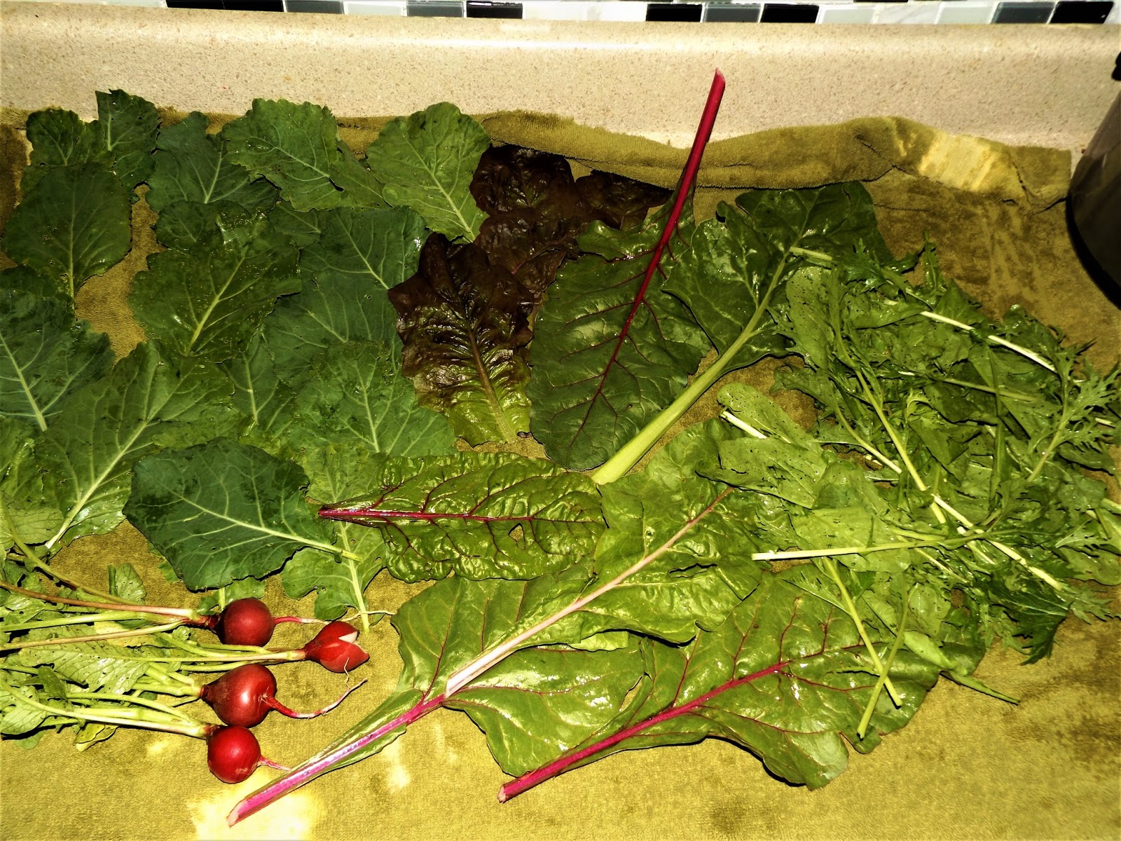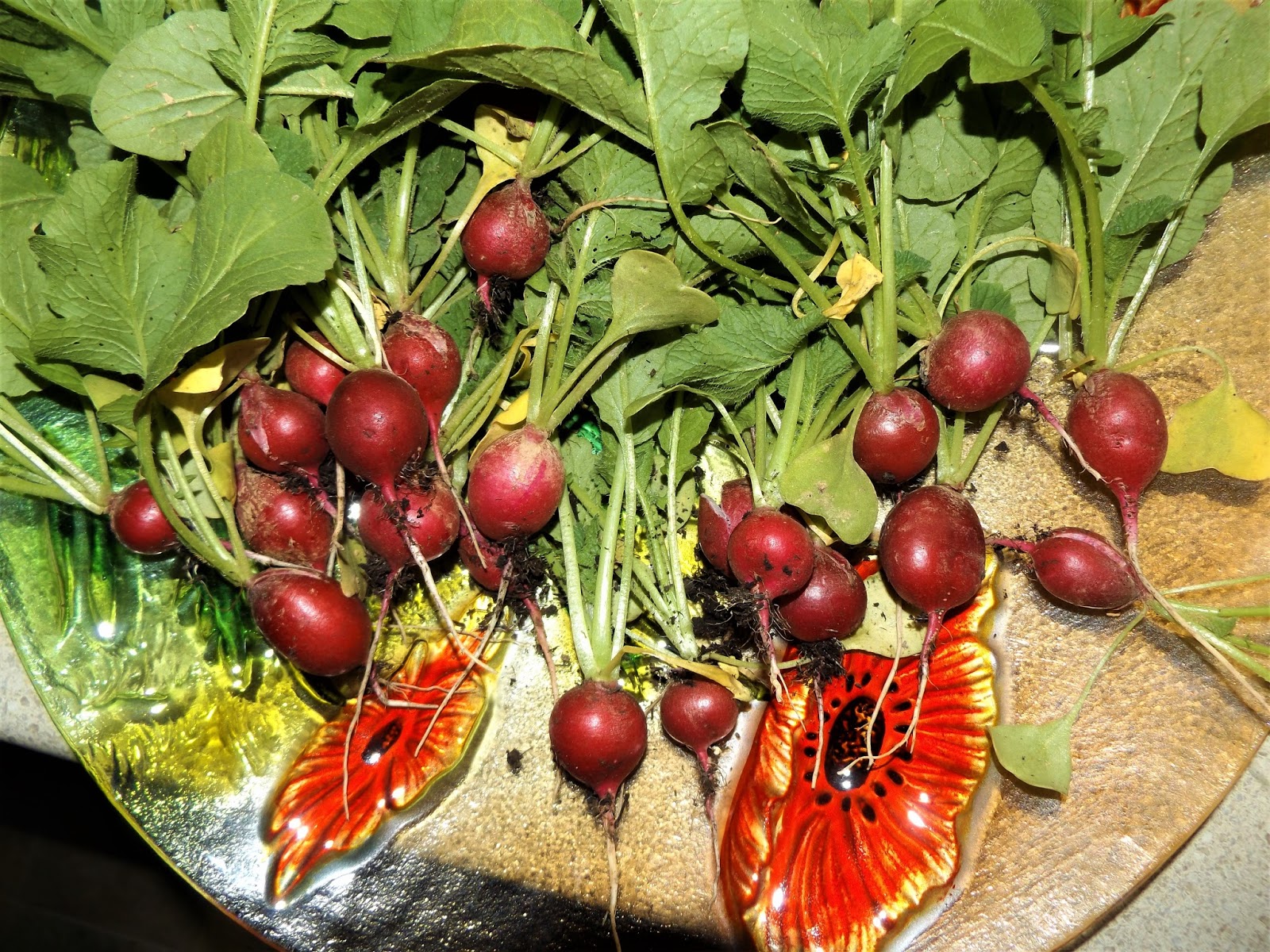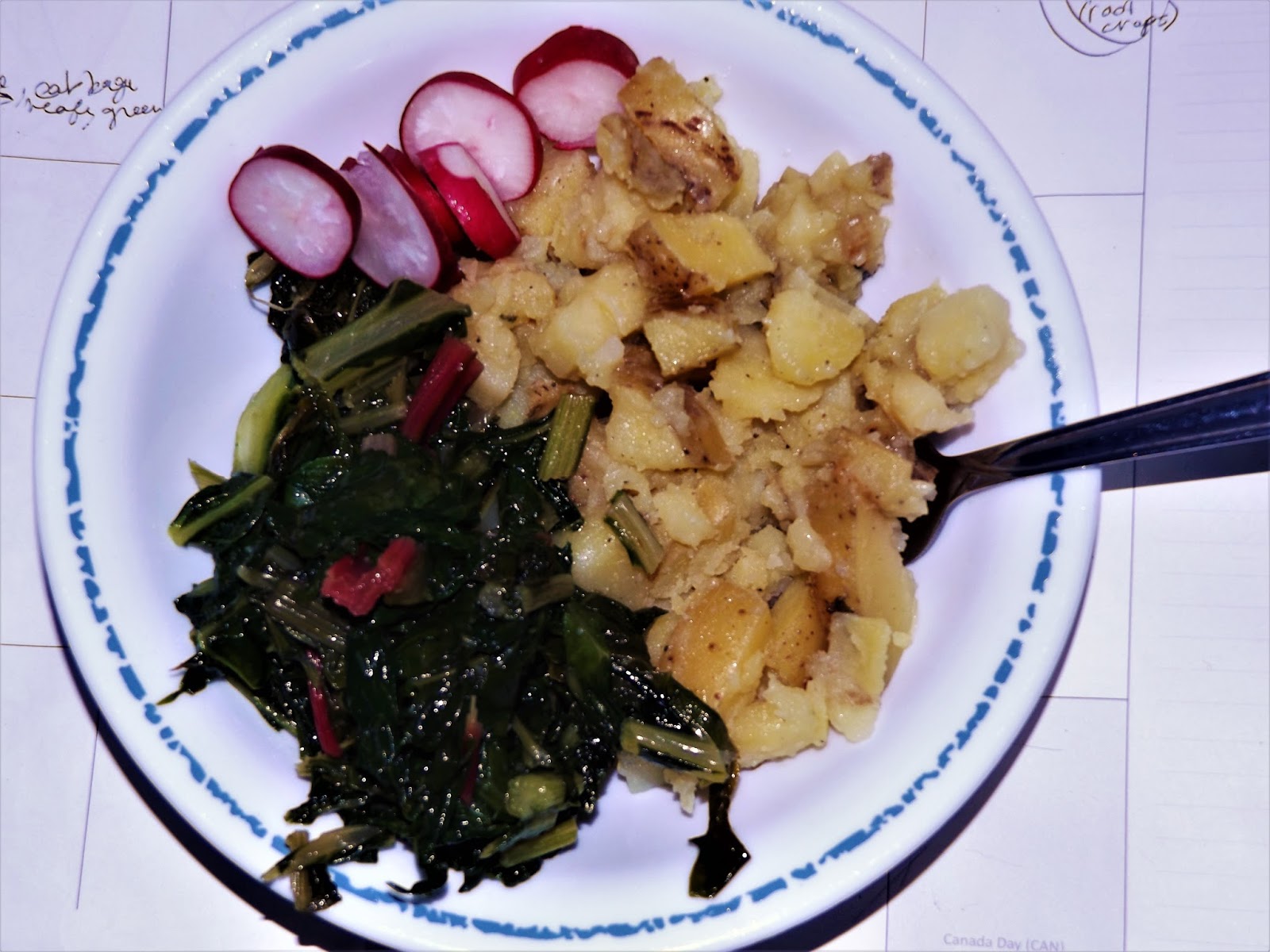 Swiss Chard from the garden was fried with a little salt, sugar, oil, red wine vinegar. Served with golden potatoes and sliced radishes from the garden.